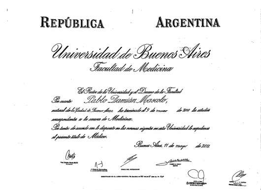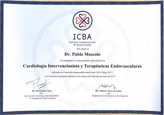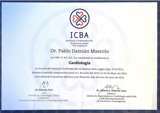 Me gradué en la U.B.A. con diploma de honor y realicé tanto mi residencia de cardiología como mi fellowship en hemodinamia en el ICBA, Instituto Cardiovascular.